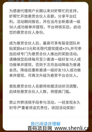 编辑点评:虾帮忙app目前来说做的人少,处于首码期,小编做的最早,邀请码是00008181,大家可以推广一下,不像其它app一样,这个软件的提成制度还是很不错的,虽然没有三级但是商家和合伙人的提成还是很诱惑的,大家如果放单的话可以去这个平台看看,估计效果比老品牌的还好点。